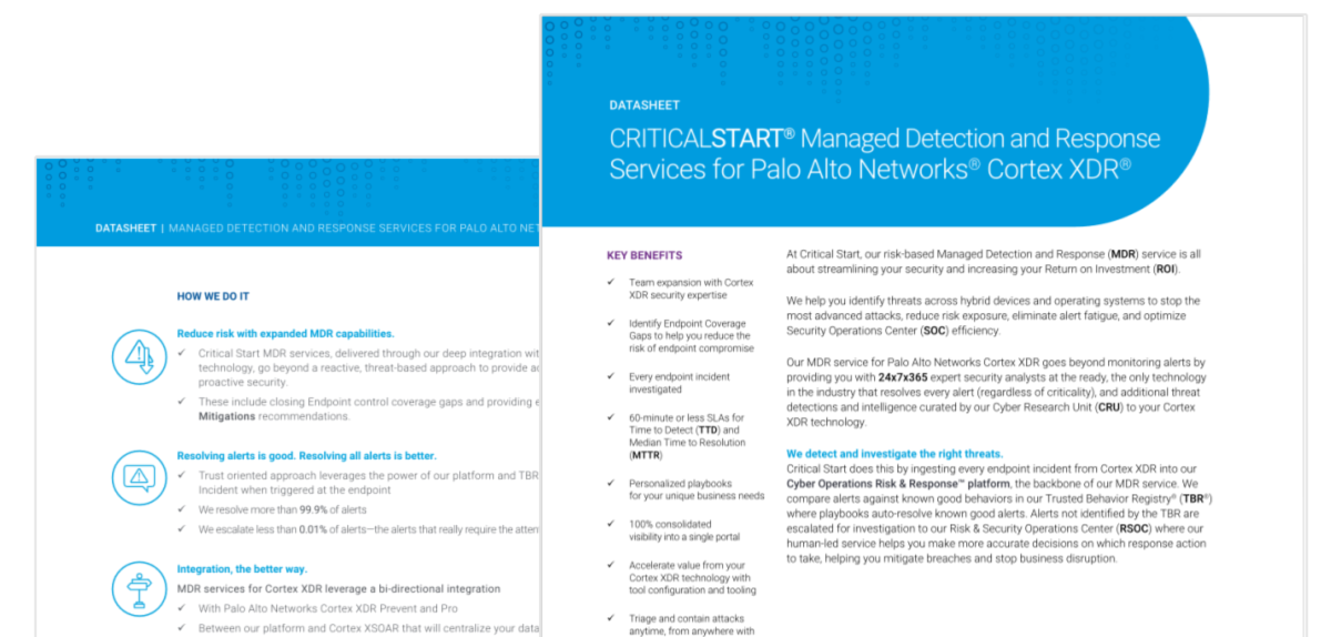 Reduce risk exposure with robust endpoint security protection and advanced cyber threat prevention by pairing Palo Alto Networks Cortex Extended Detection and Response (XDR) Service with Critical Start’s Managed Detection and Response (MDR).
