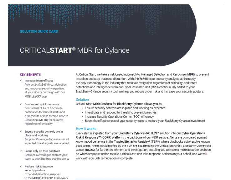 Using the power of BlackBerry CylancePROTECT, Critical Start delivers AI + human-powered threat prevention combined with application and script control, memory protection, and device policy enforcement to identify and block threats before they can cause harm.
