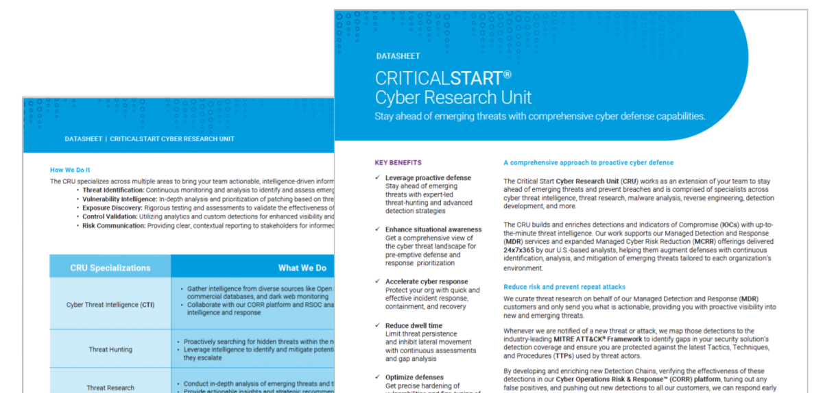 With expert-led threat-hunting and comprehensive cyber defense capabilities, the Critical Start Cyber Research Unit (CRU) works as an extension of your team to help you reduce risk and stay ahead of emerging threats.