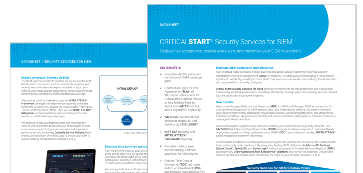 Critical Start’s Security Services for SIEM combines Managed SIEM and MDR for SIEM to deliver cost-effective and comprehensive threat detection and response services while reducing risk acceptance and optimizing the performance of leading SIEM platforms.